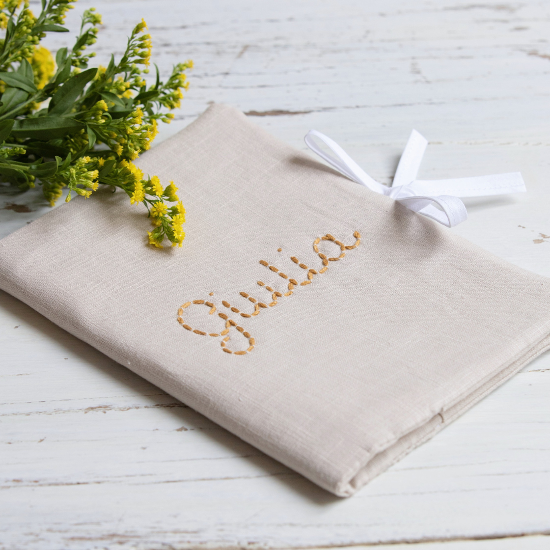 The health book covers allow you to cover the French health book and/or store important papers. They are hand-embroidered and handcrafted in our own atelier using organic cotton fabrics that are Oeko-Tex certified. You can personalise your health book with a name, word, or initials in your favorite colour!