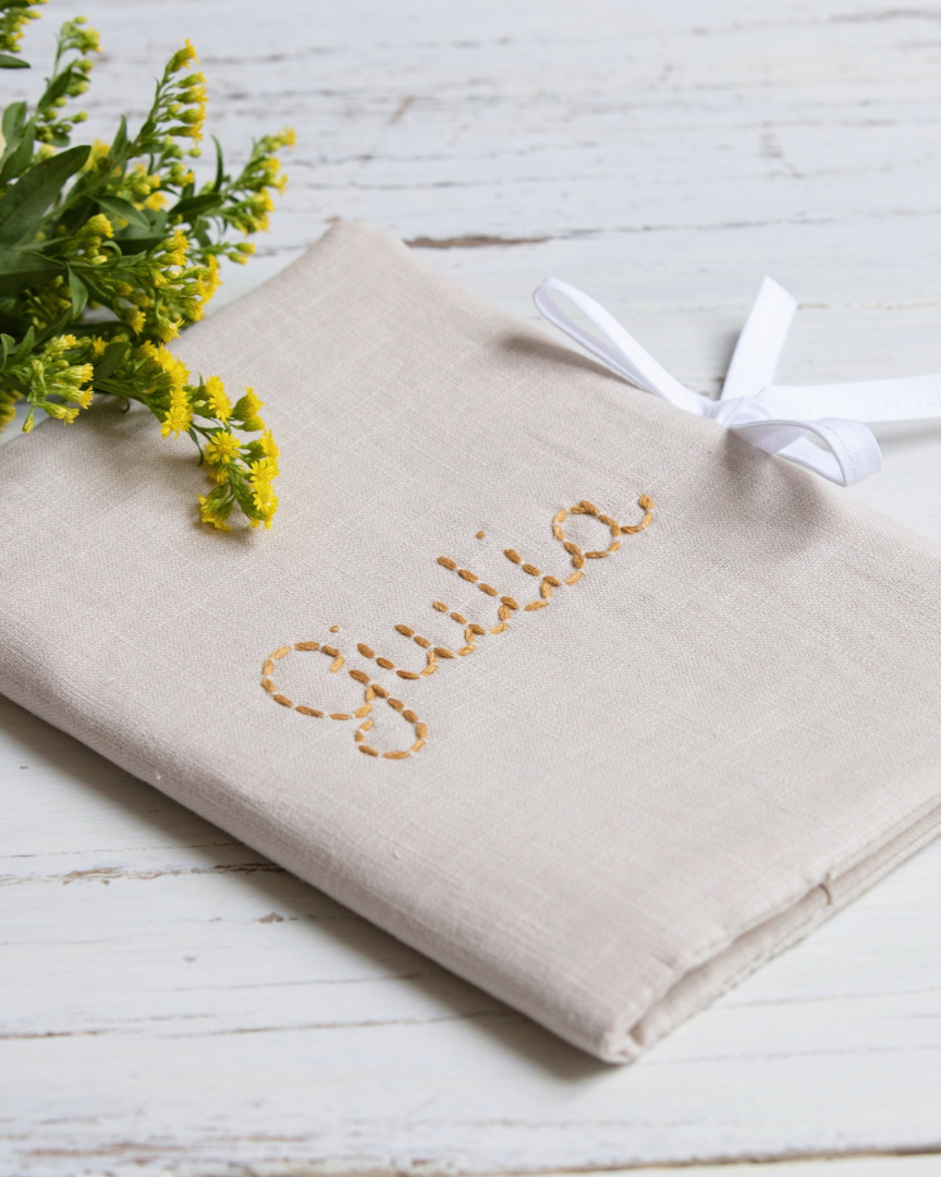 The health book covers allow you to cover the French health book and/or store important papers. They are hand-embroidered and handcrafted in our own atelier using organic cotton fabrics that are Oeko-Tex certified. You can personalise your health book with a name, word, or initials in your favorite colour!