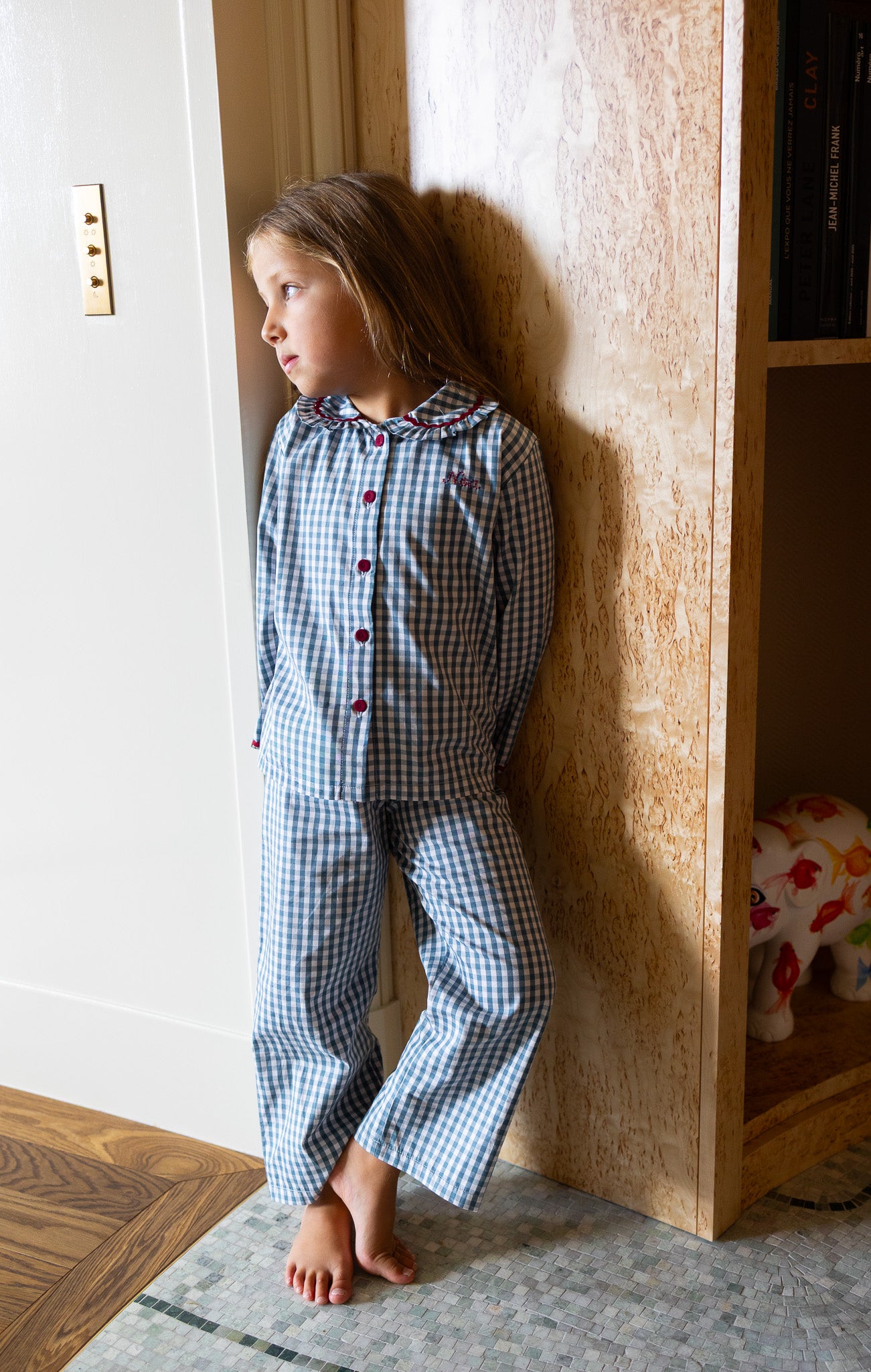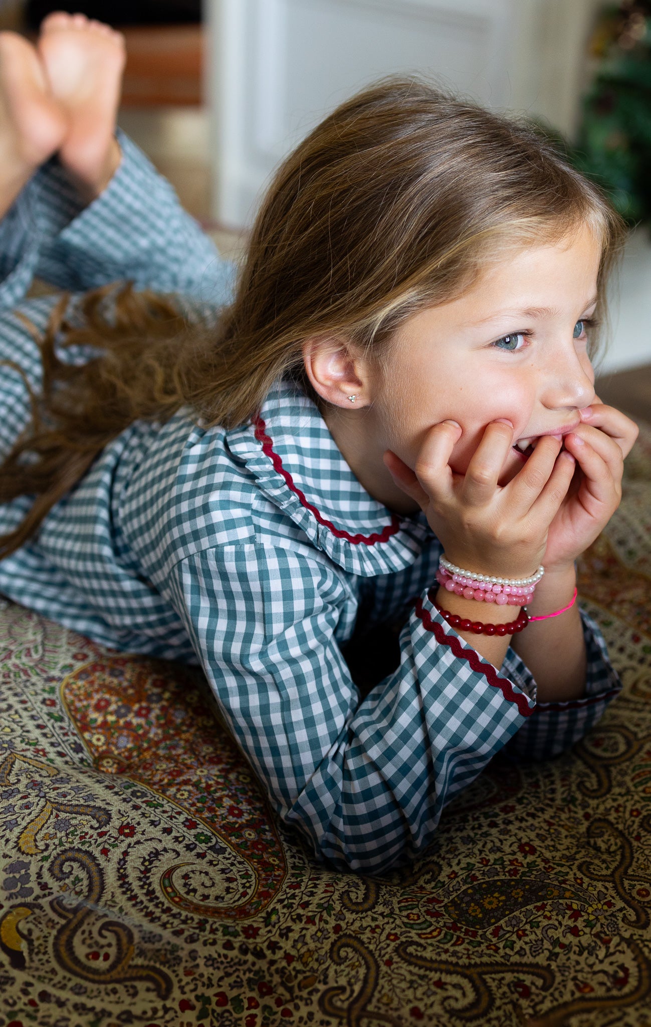 Very comfortable and soft pyjama set. It features a dark green gingham print with burgundy details on the collar and sleeves. The top is buttoned up in the front.