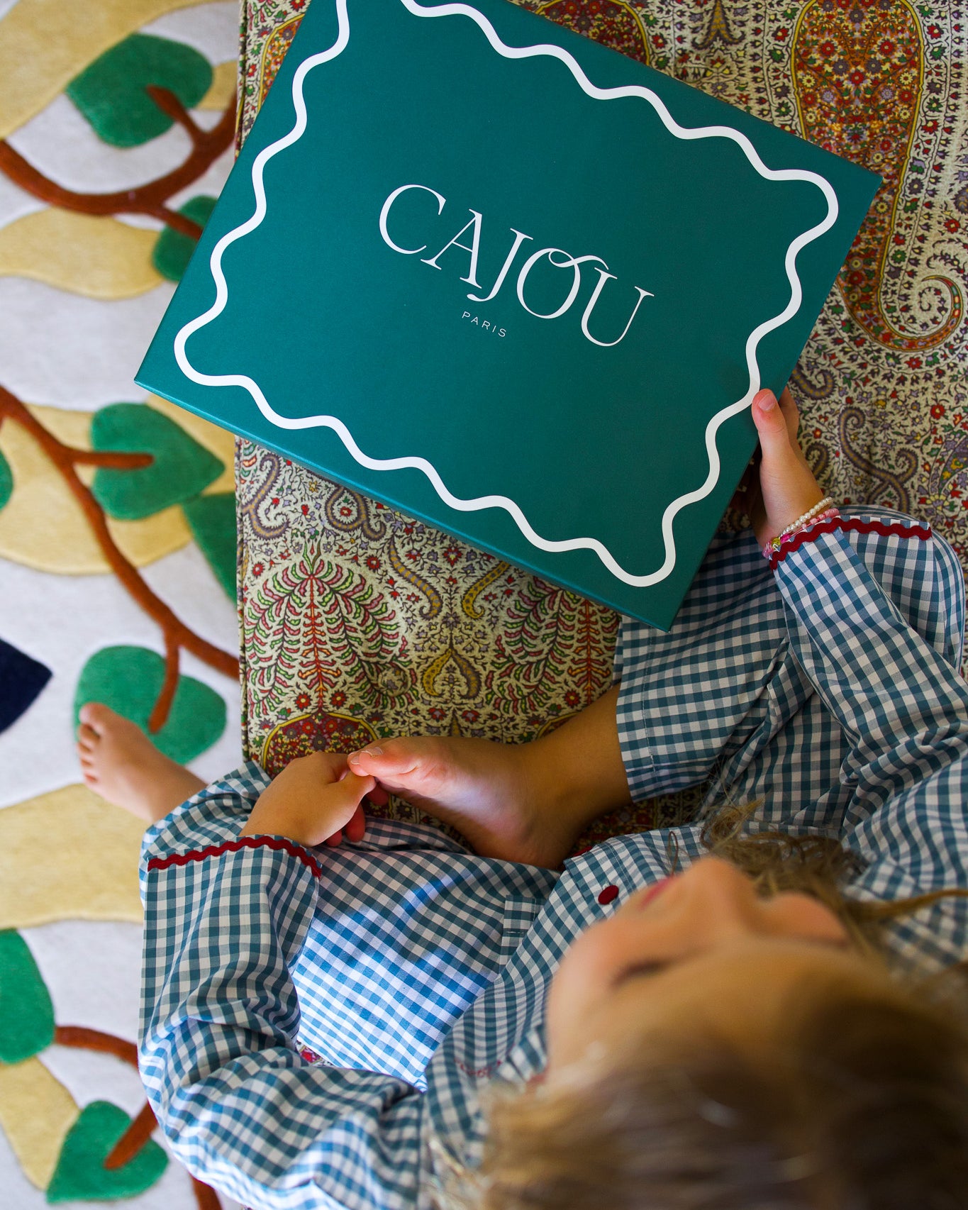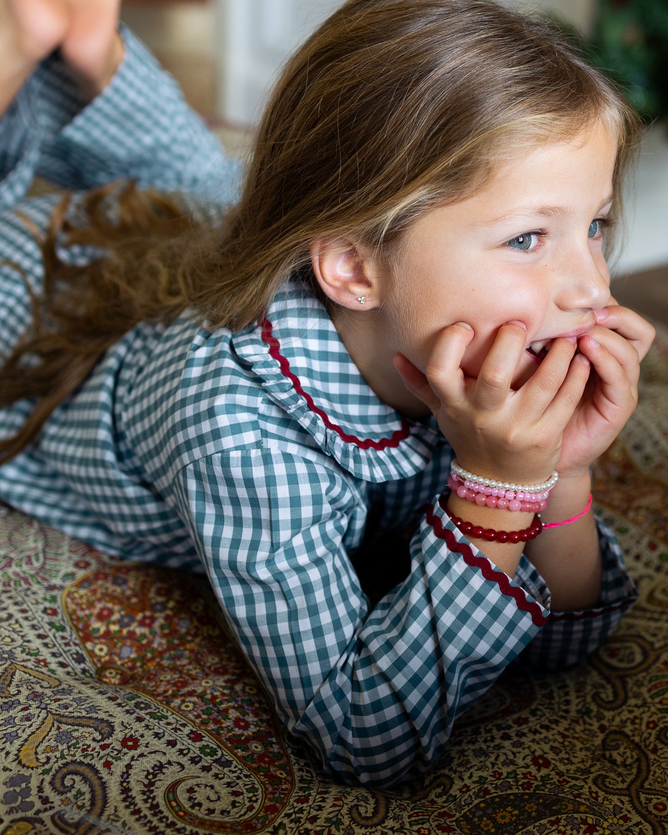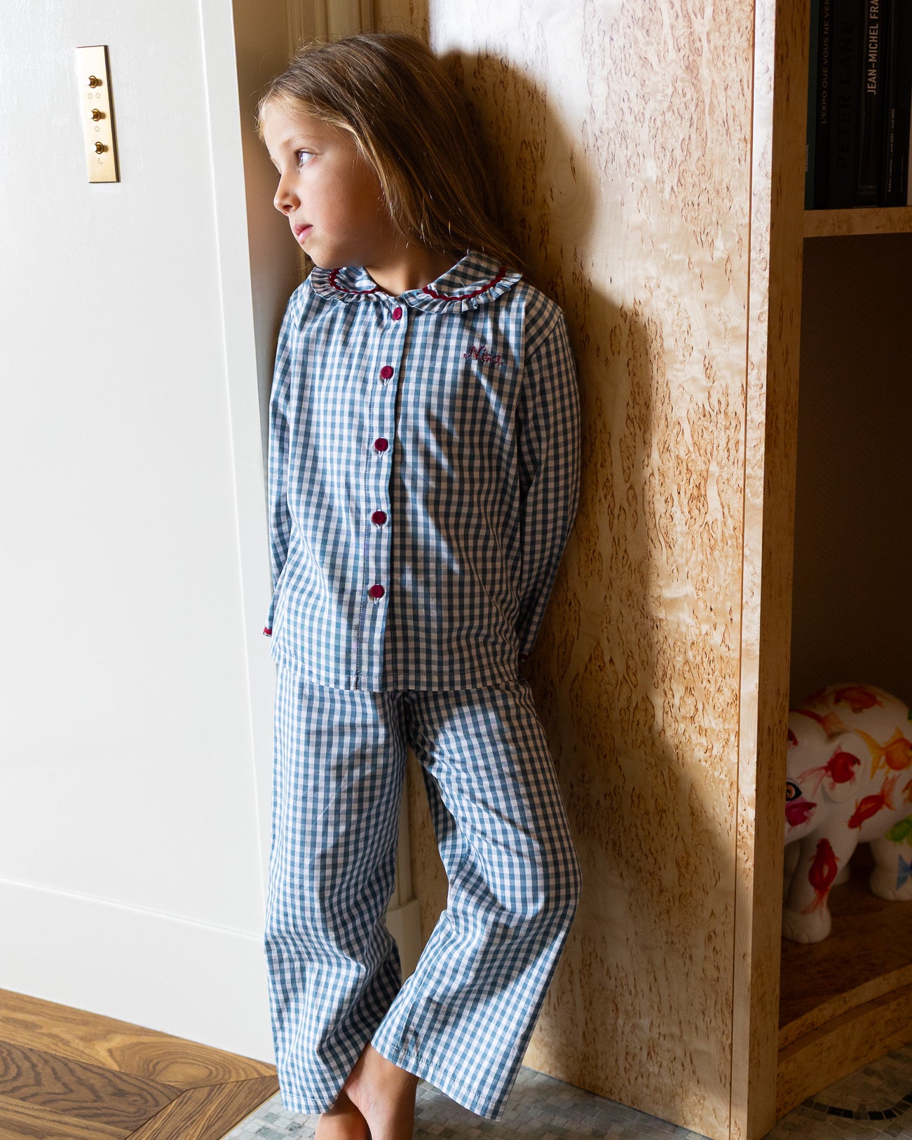 Very comfortable and soft pyjama set. It features a dark green gingham print with burgundy details on the collar and sleeves. The top is buttoned up in the front.