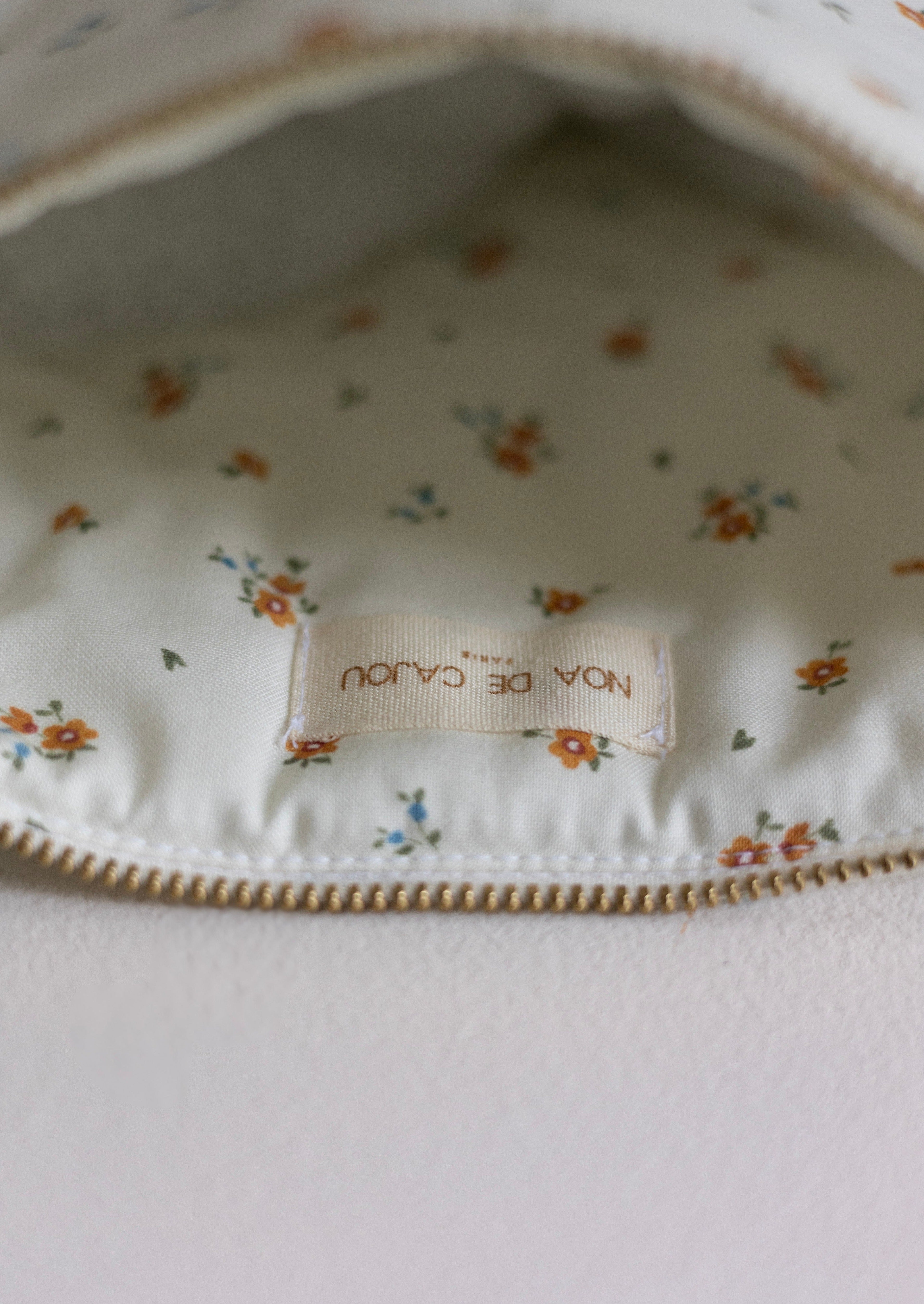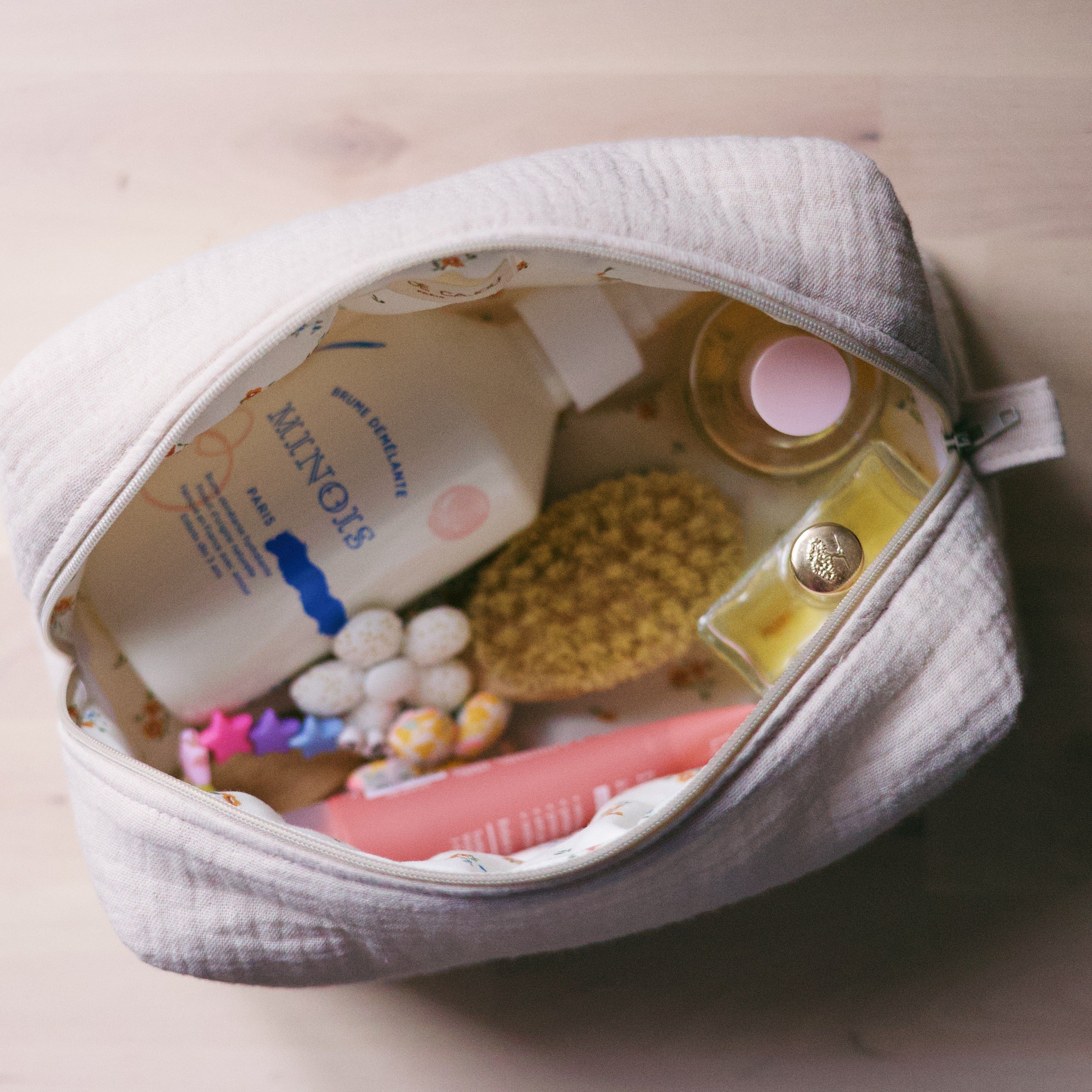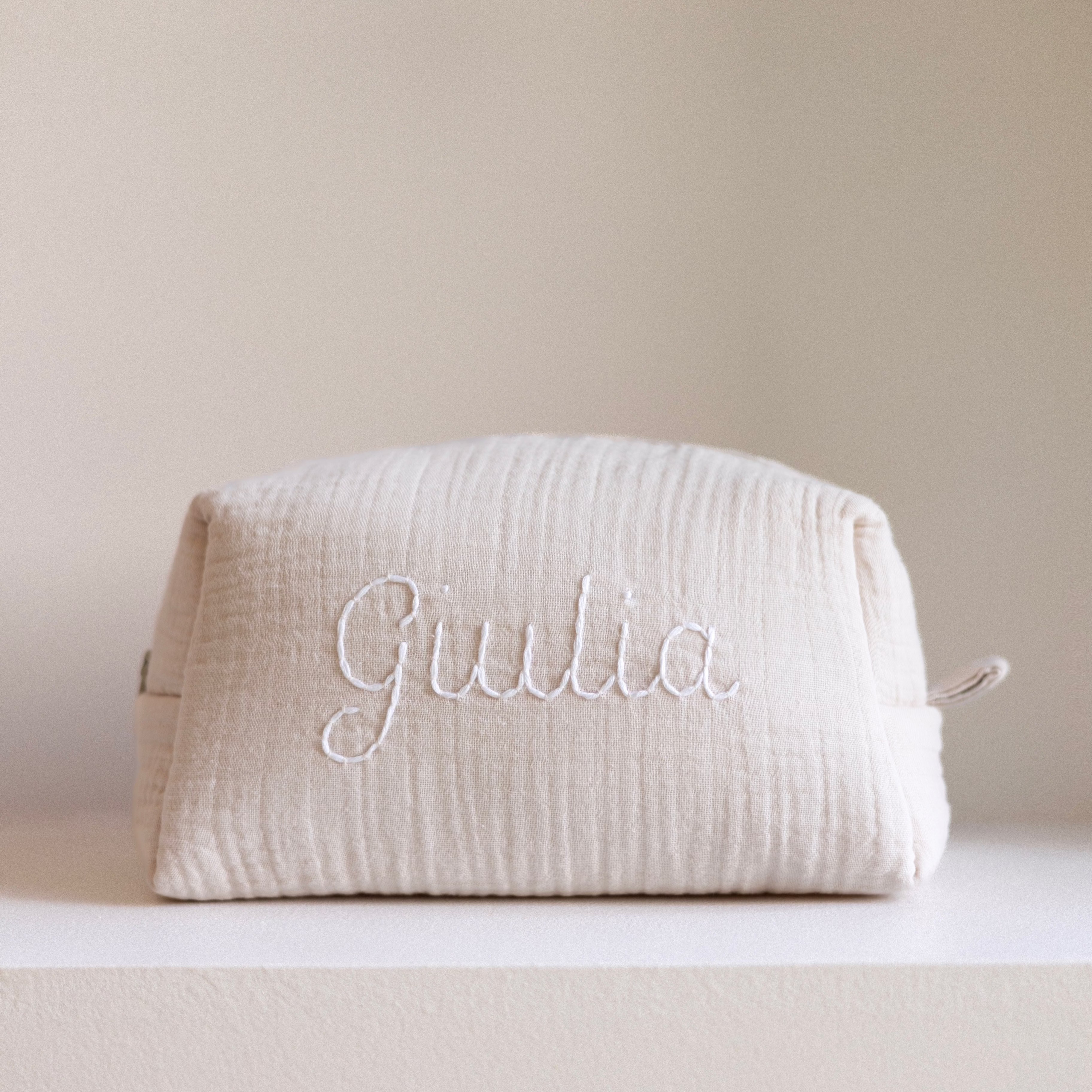 This zipped pouch is hand embroidered in our atelier. The fabrics used are organic and Oeko-Tex certified. You can personalise your pouch with a name or with initials in your favorite color!
