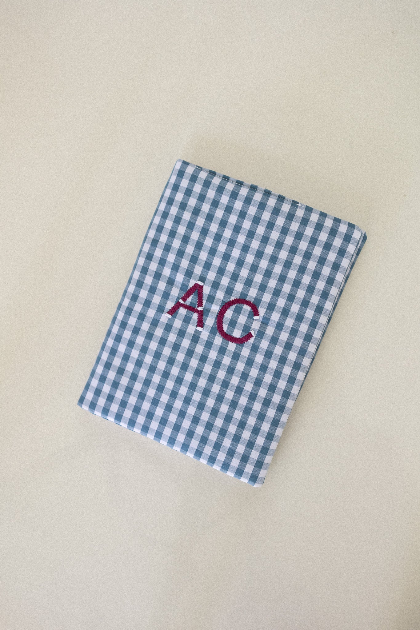 Our notebook or agenda cover fits all standard A5 notebooks and planners. Each piece is hand-embroidered and handcrafted in our own atelier using organic, Oeko-Tex certified cotton. The design features dark green vichy. You can personalise your cover with a name, word, or initials in your favourite colour!