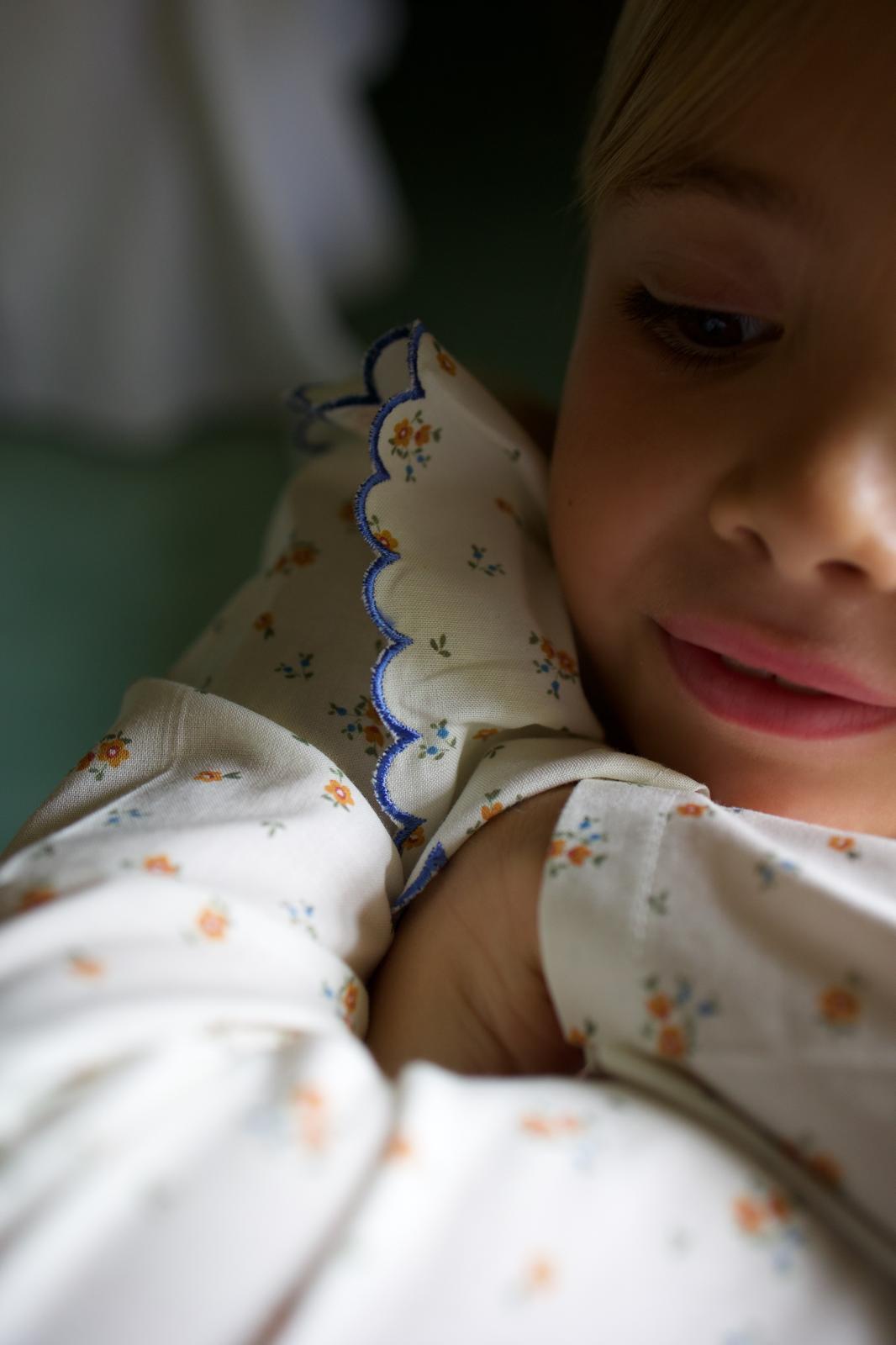 Very comfortable and soft pyjama set. It features a flower print with a pleated collar. The top is buttoned up in the front.
