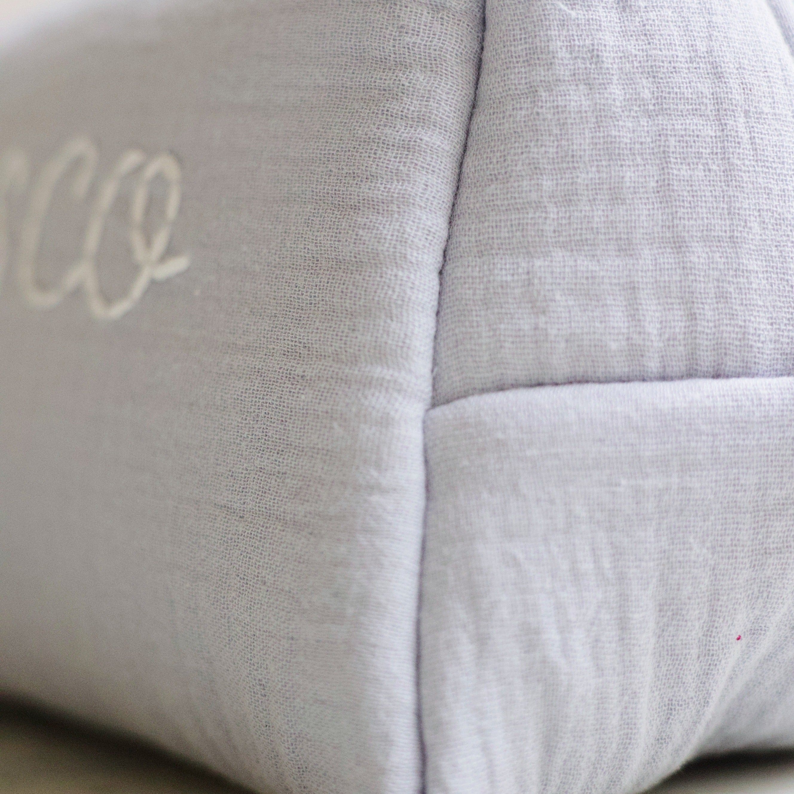 The toiletry bag is hand-embroidered in our own atelier. The fabric is an organic double gauze cotton and Oeko-Tex certified. You can personalise your toiletry bag with a name, word, or initials in your favourite colour!