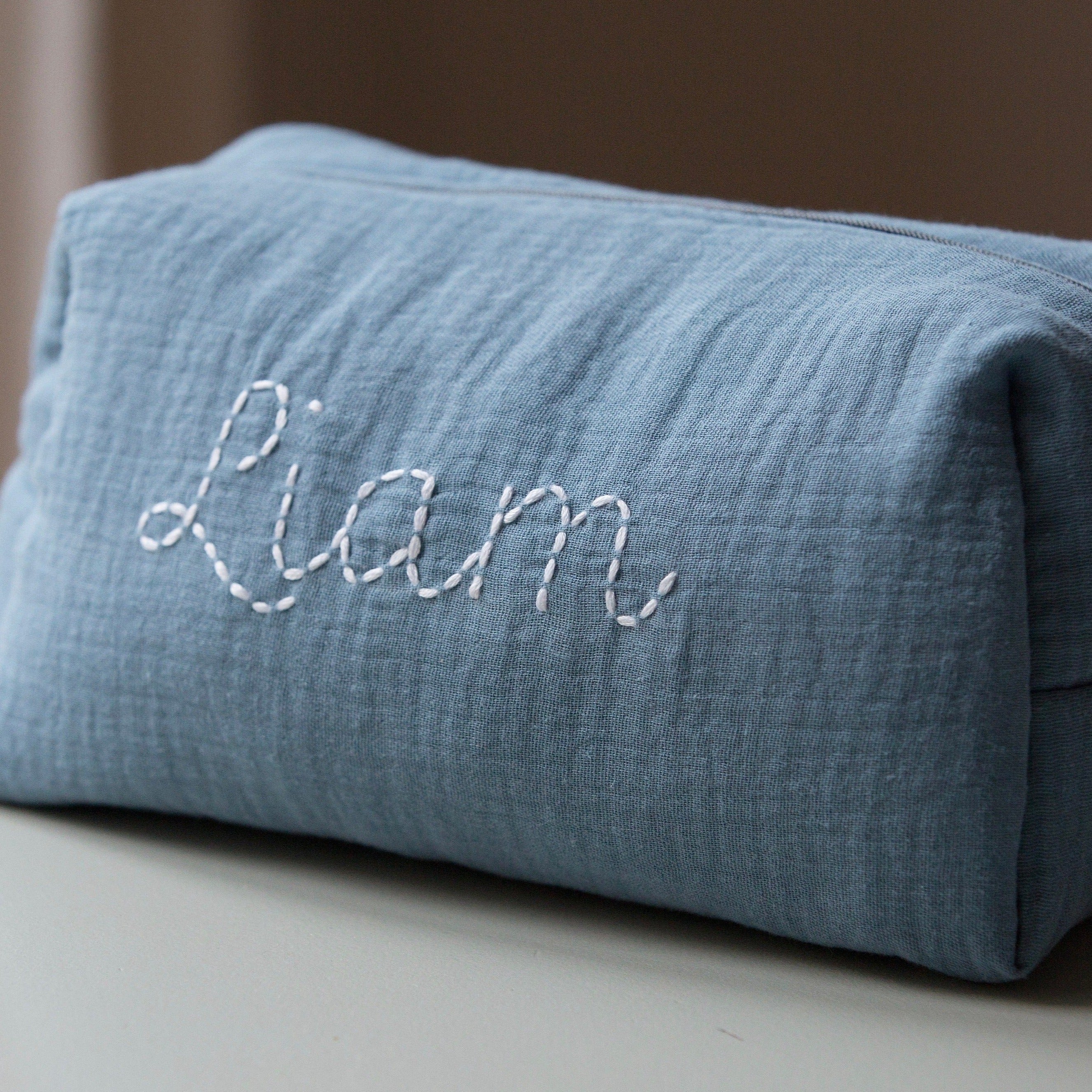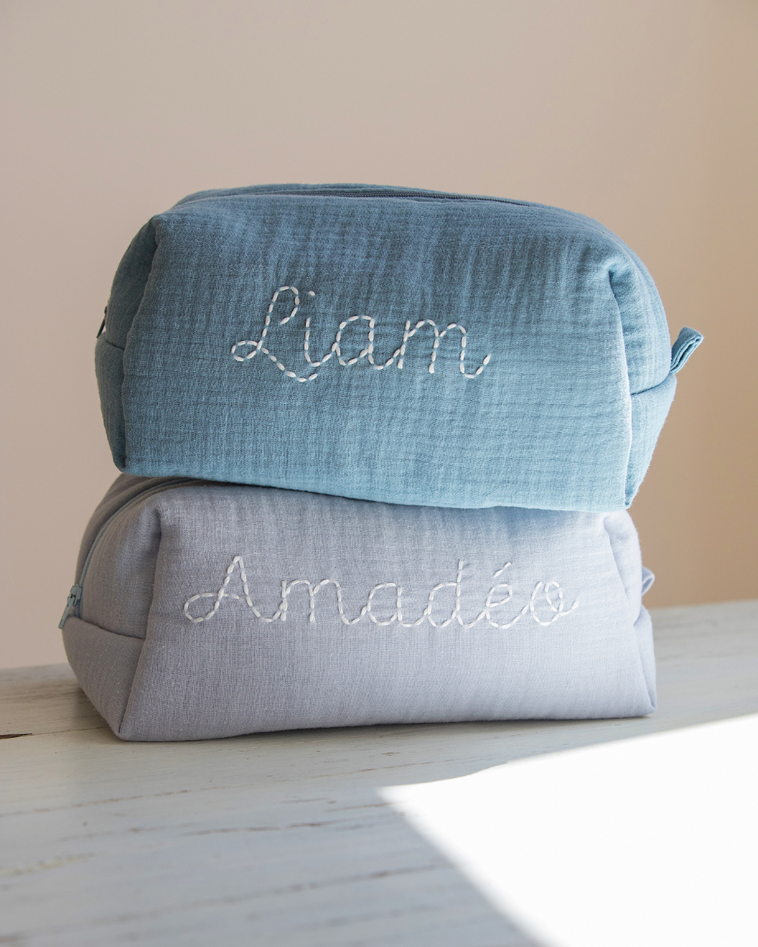 The toiletry bag is hand-embroidered in our own atelier. The fabric is an organic double gauze cotton and Oeko-Tex certified. You can personalise your toiletry bag with a name, word, or initials in your favourite colour!