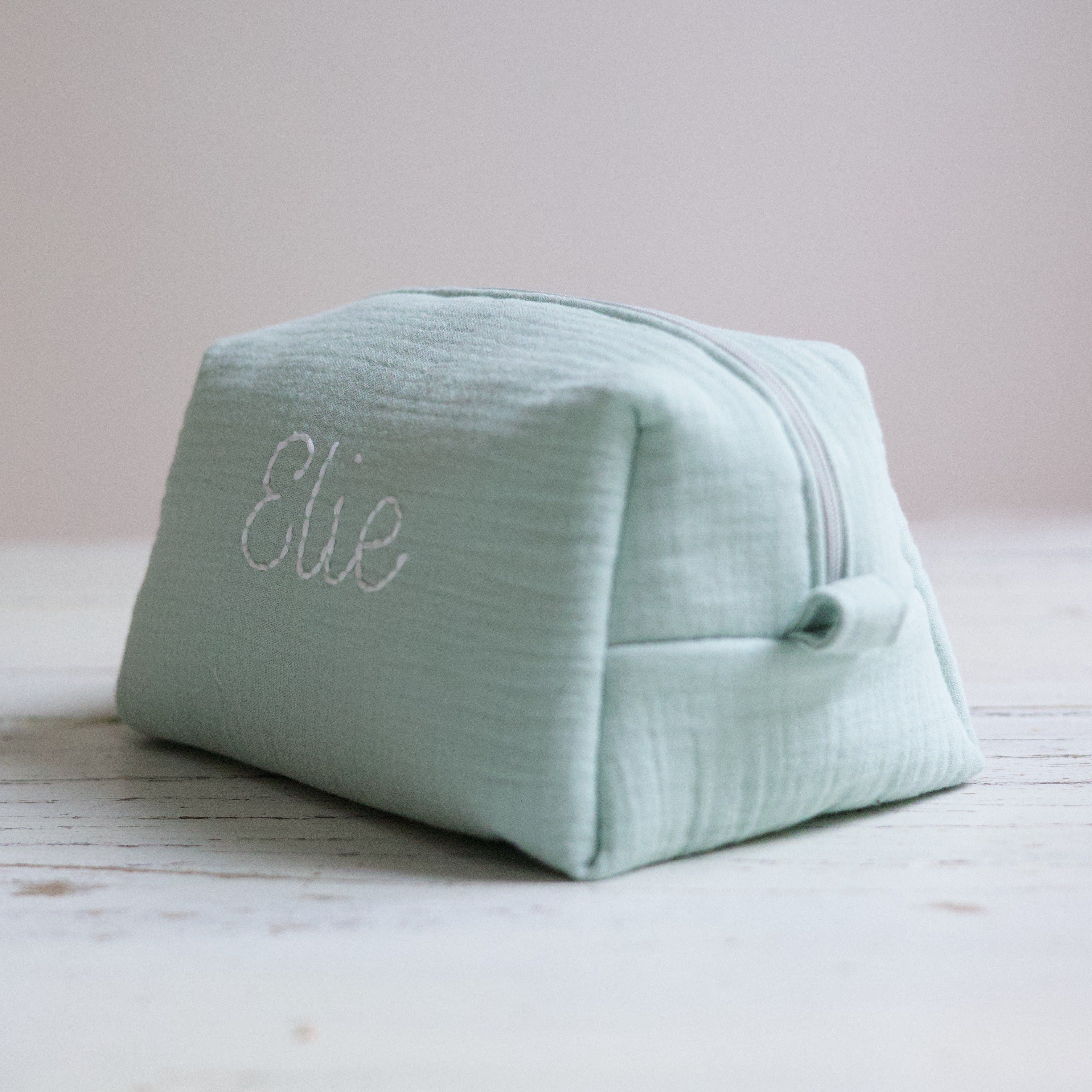 The toiletry bag is hand-embroidered in our own atelier. The fabric is an organic double gauze cotton and Oeko-Tex certified. You can personalise your toiletry bag with a name, word, or initials in your favourite colour!
