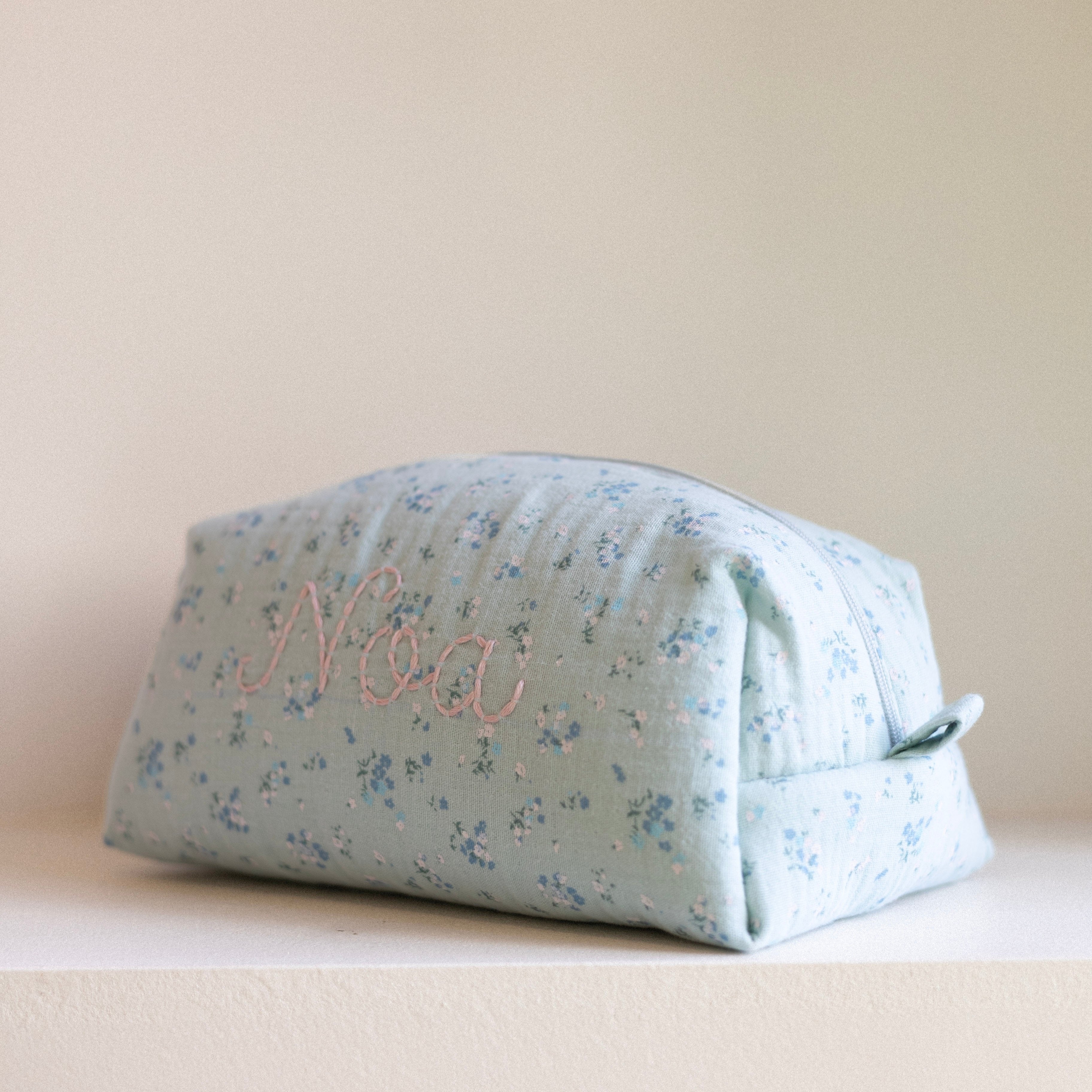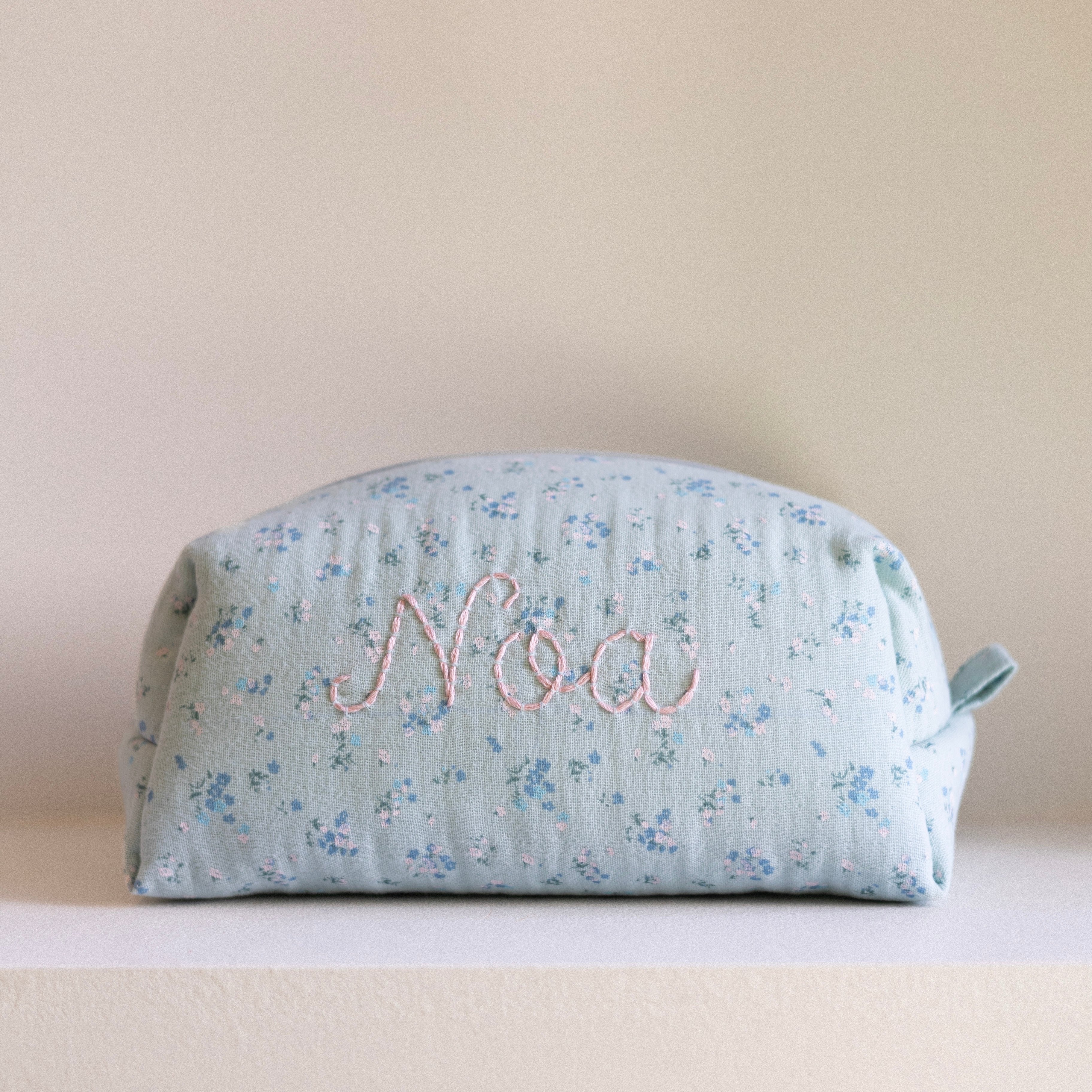 The toiletry bag is hand-embroidered in our own atelier. The fabric is an organic double gauze cotton and Oeko-Tex certified. You can personalise your toiletry bag with a name, word, or initials in your favourite colour!