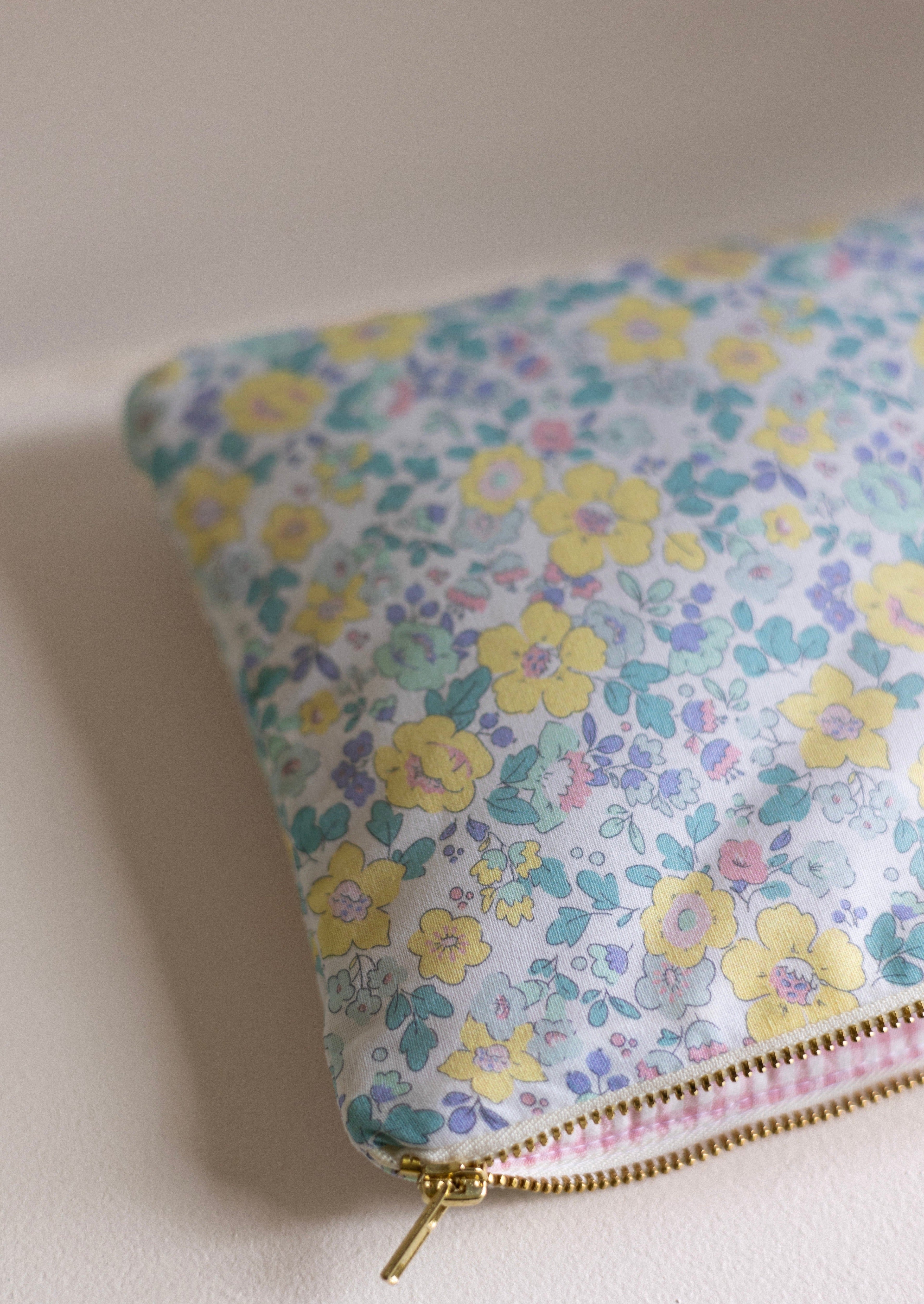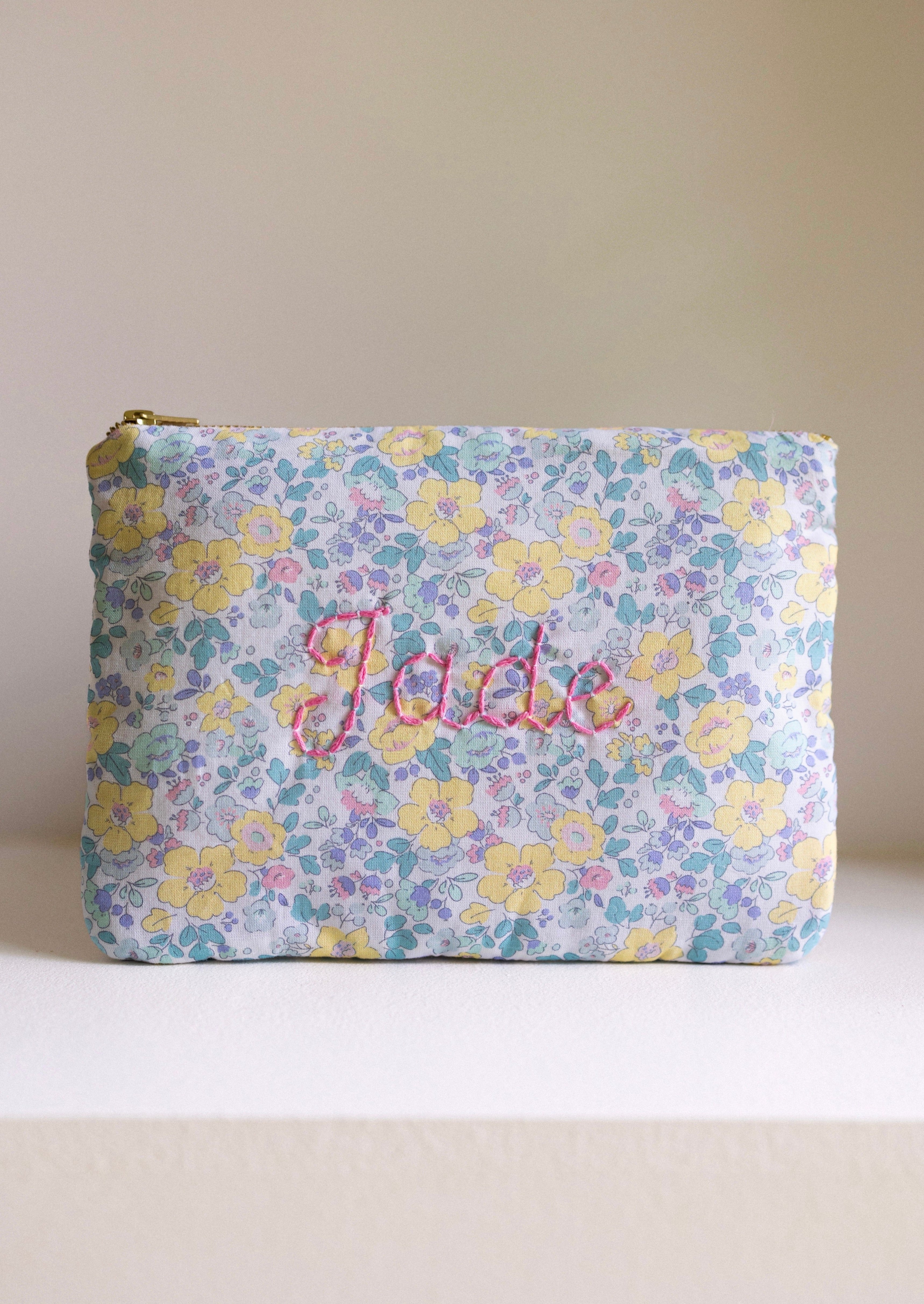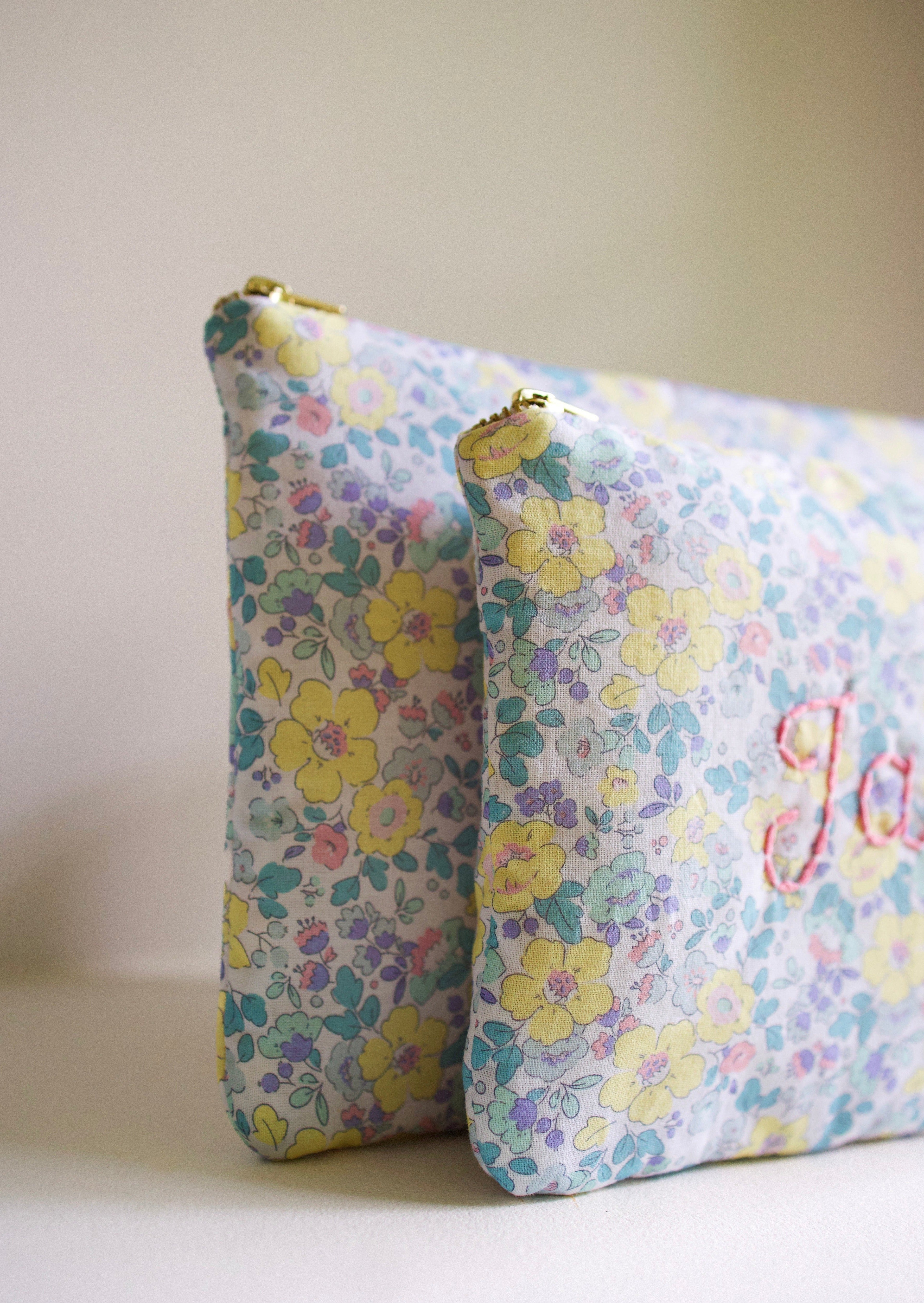 This zipped pouch is hand embroidered in our atelier. The fabrics used are organic and Oeko-Tex certified. You can personalise your pouch with a name or with initials in your favorite color!