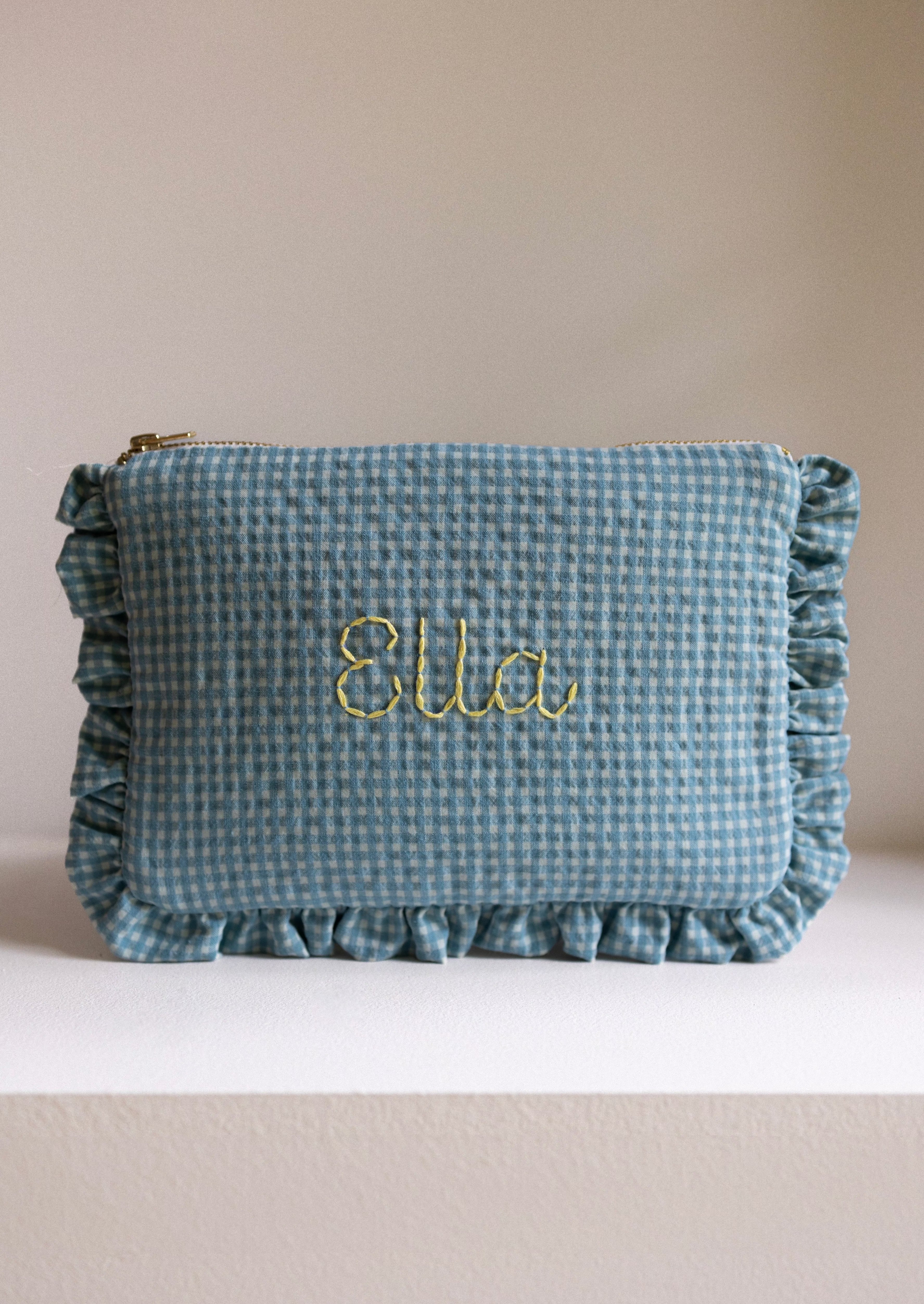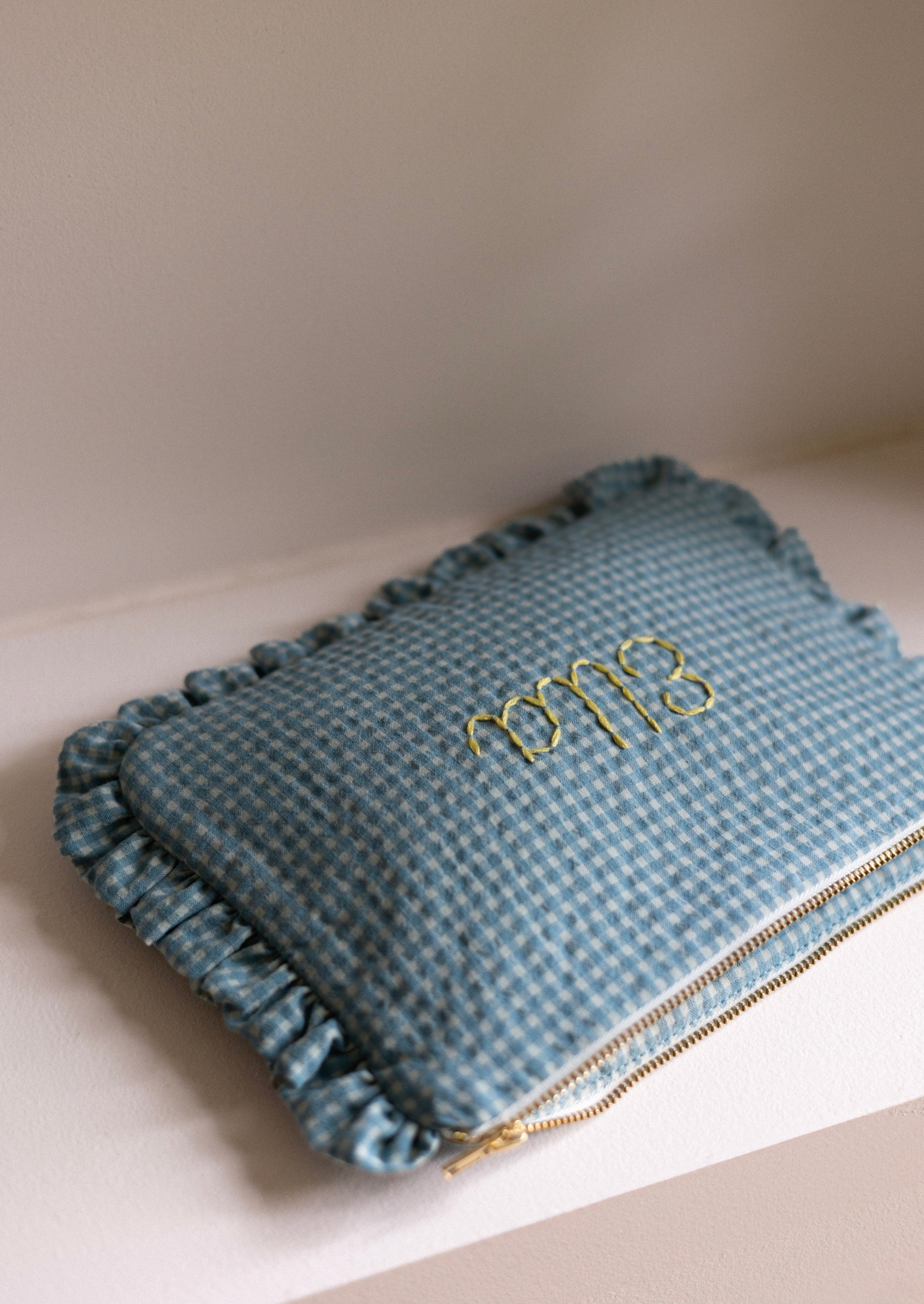This zipped pouch is hand embroidered in our atelier. The fabrics used are organic and Oeko-Tex certified. You can personalise your pouch with a name or with initials in your favorite color!